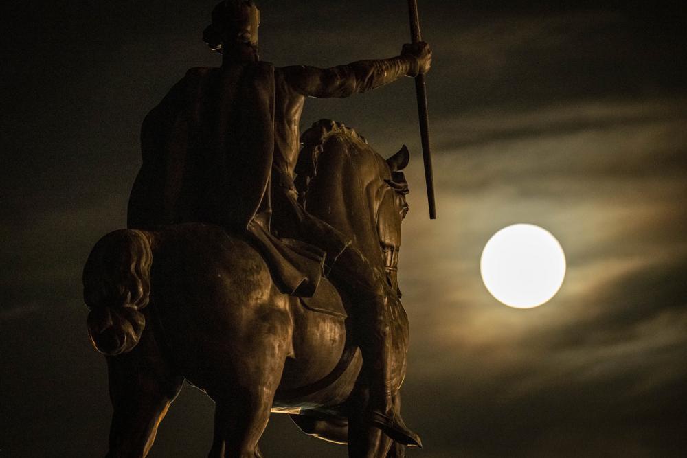Một siêu trăng chiếu rọi tác phẩm điêu khắc Vua Tomislav, vị vua đầu tiên của Croatia, ở trung tâm thành phố Zagreb vào ngày 14/6.