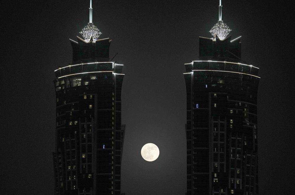 Trăng tròn mọc giữa hai tòa tháp ở Dubai, Các Tiểu vương quốc Arab Thống nhất (UAE) vào hôm 14/6.