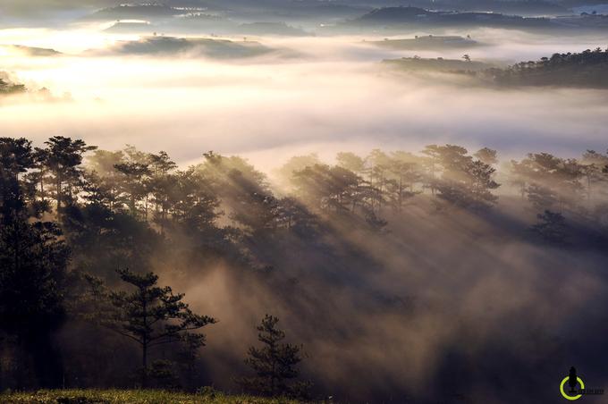 Khi mặt trời lên cao, ánh sáng ngày mới chiếu qua những tán thông rậm rạp bên dưới tạo nên những luồng "ray sáng" hoàn hảo.
