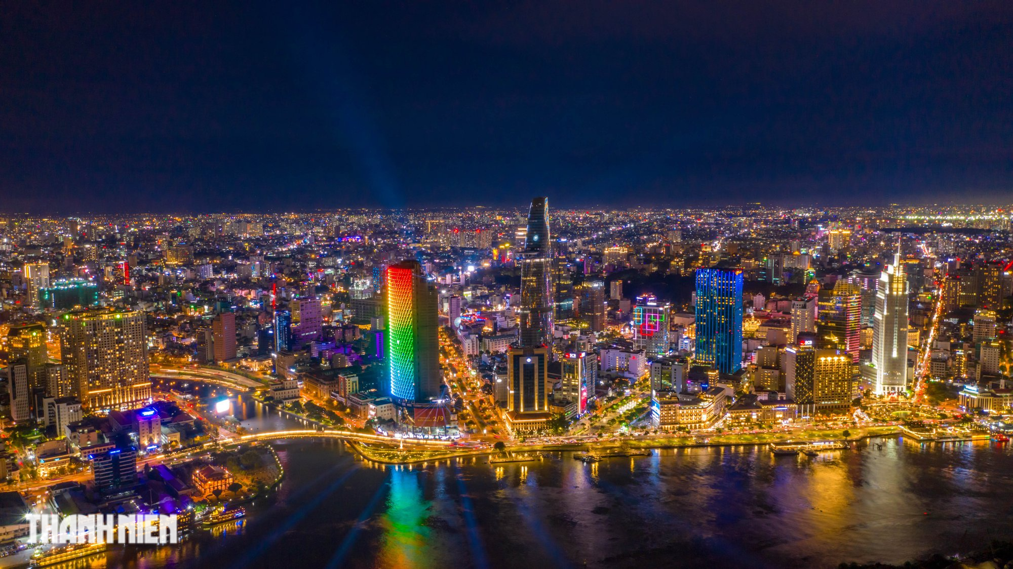 TP.HCM trong ánh đèn đêm huyền ảo nhìn từ phía Thủ Thiêm với những tòa nhà biểu tượng và nhiều cái tên thân thuộc: bến Bạch Đằng, phố đi bộ Nguyễn Huệ, bến Nhà Rồng, cầu Khánh Hội... đẹp rực rỡ (ảnh: BÙI VĂN HẢI).(Nguồn: Bùi Văn Hải, Thanh Niên, 19/02/2023, 13:15 (GMT+7))