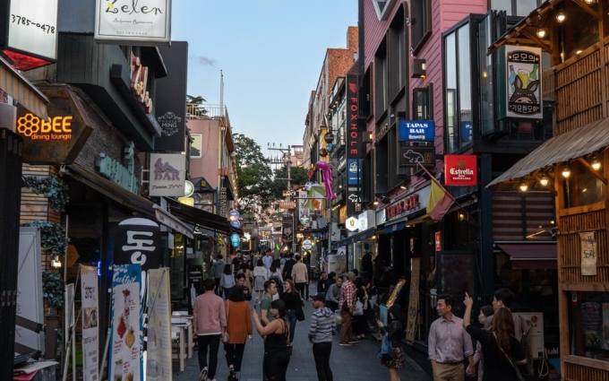 Itaewon - khu vực nổi tiếng với khách quốc tế tại Seoul. Ảnh: Seoul guide Itaewon nằm ngay trung tâm quận Yongsan, thủ đô Seoul, được mệnh danh là "phố Tây Hàn Quốc" vì sự náo nhiệt, sôi động, đặc biệt vào ban đêm. Nơi đây cũng tập trung rất nhiều người nước ngoài từ khắp nơi đổ về sinh sống, tham quan. Ước tính, hiện Itaewon là nơi ở của hơn 20.000 người nước ngoài.