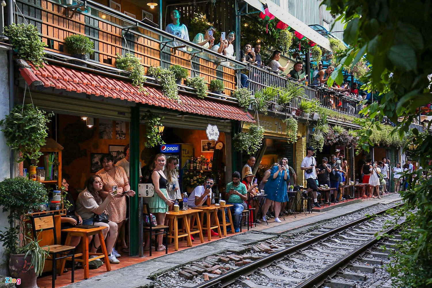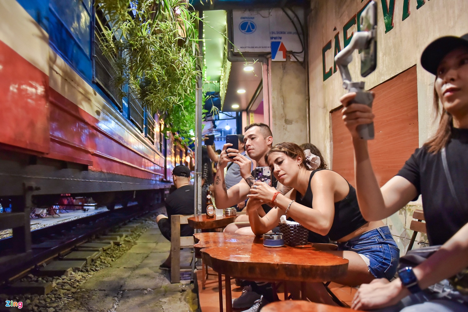 Nhiều du khách nước ngoài thích thú khi tới "phố đường tàu", vừa uống cà phê vừa trải nghiệm cảm giác mạnh mỗi khi có đoàn tàu chạy qua.