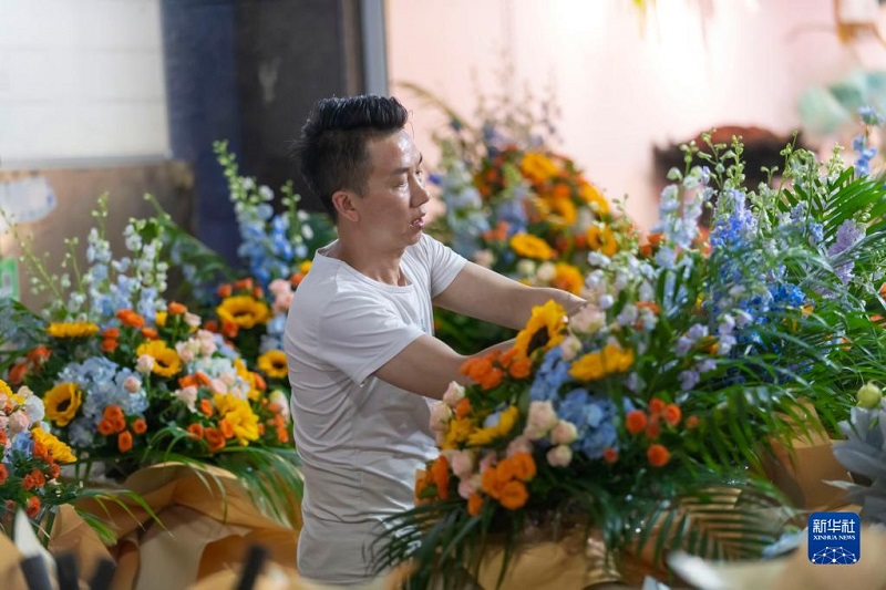 Một khách hàng đi mua hoa ở chợ hoa Đẩu Nam vào tối ngày 12/7. Không chỉ có hoa hồng, chợ hoa Côn Minh còn bày bán rất nhiều loài hoa khác nhau. Từ cúc, lan, ly, cẩm chướng...cho tới hoa xương rồng, hoa đá, cây cảnh...Và thêm nữa, nơi đây còn được bày bán rất nhiều loại hoa khô chất lượng cao. Hoa khô ở đây được bó thành từng bó, có lớn nhỏ để phù hợp với nhu cầu của du khách tham quan chợ hoa.