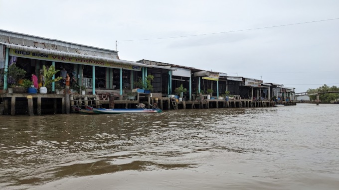 Thi thoảng cano sẽ ghé vào bờ để đón trả khách. Hai bên bờ là vô số loài cây ngập mặn như đước, dừa nước mọc san sát. Những ngôi nhà mái tôn xếp cạnh nhau sát mặt nước trông như dãy ki ốt, có trụ bê tông bám đầy hà. Người dân chủ yếu kinh doanh tạp hóa và sửa chữa động cơ tàu bè.