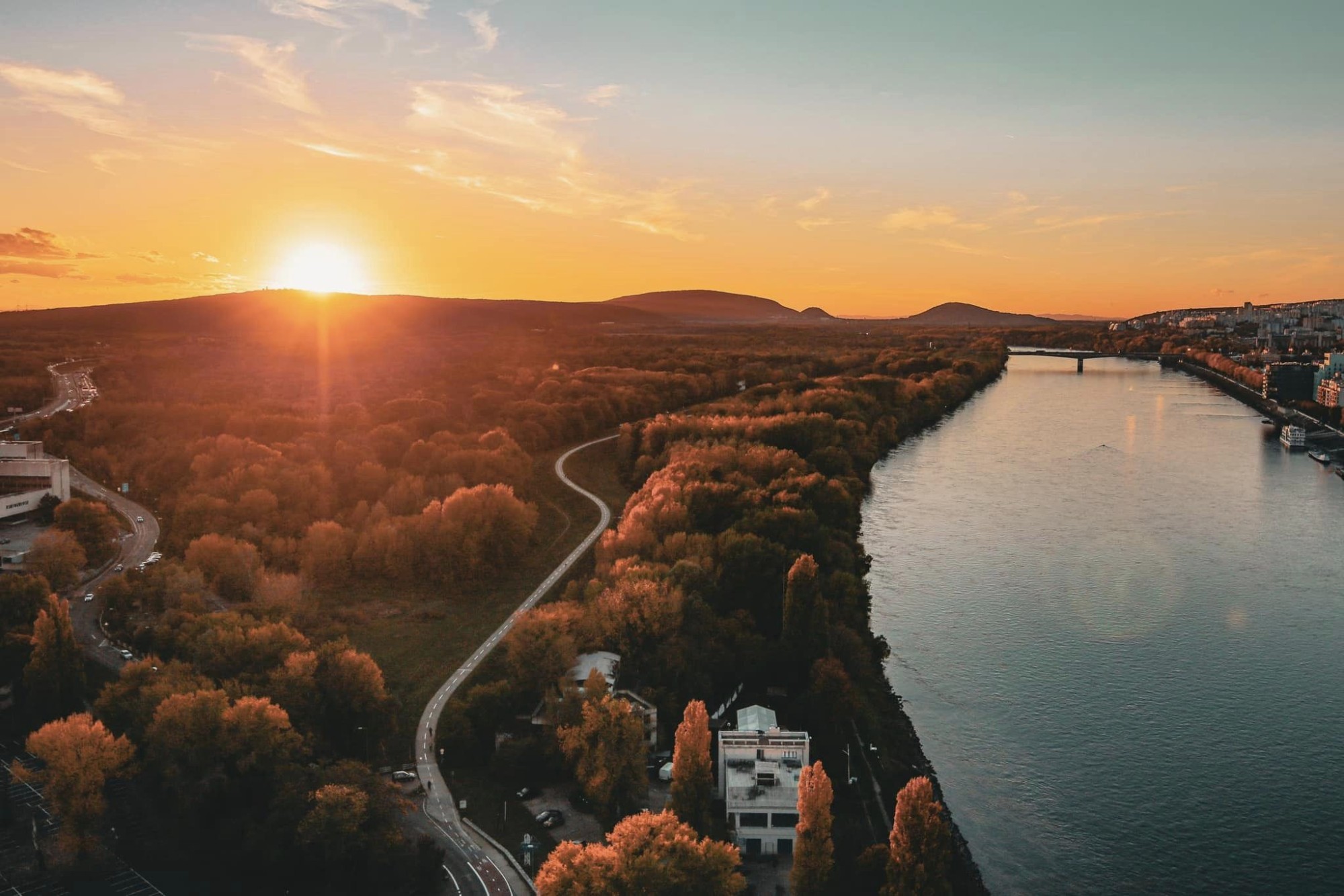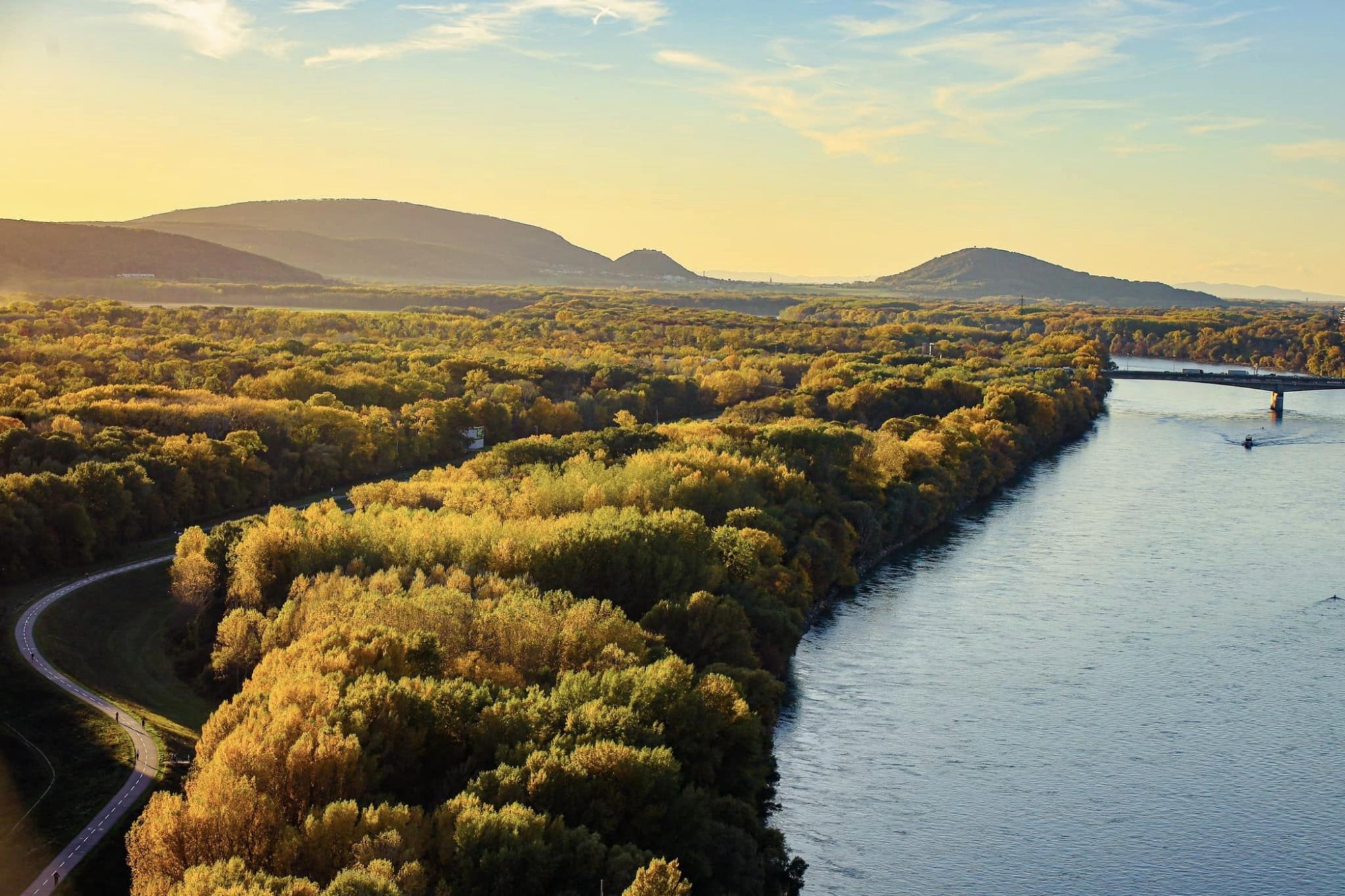 Mùa thu tại Bratislava đẹp nhất vào cuối tháng 10, đầu tháng 11 hàng năm khi sắc vàng nhuộm kín khắp các con đường, góc phố, khu rừng, tiết trời se se lạnh, dễ chịu. Dọc bờ sông Danube - con sông chảy qua tám nước châu Âu, những hàng cây đang mùa thay lá, đẹp mộng mơ. "Những bức ảnh này được tôi ghi lại vào khoảng 17-18h chiều, từ trên điểm ngắm cảnh của cầu UFO. Ngày đẹp trời, nơi đây thu hút rất đông người dân và du khách tìm tới chiêm ngưỡng, chụp ảnh khung cảnh mùa thu bao trùm thành phố. Chi phí lên đây là khoảng 10 Euro/người (khoảng 250.000 đồng)", anh An cho biết.