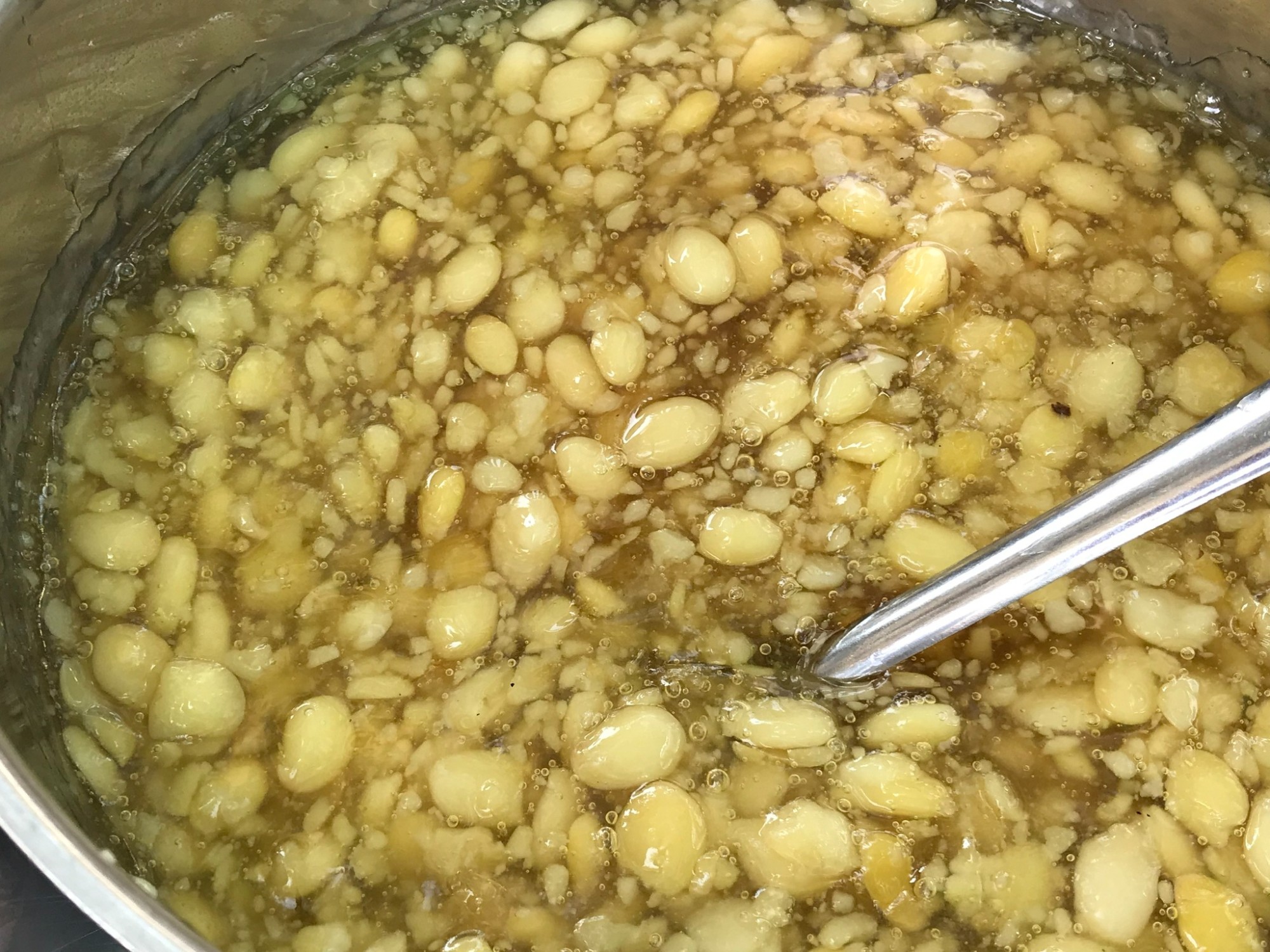Khi thưởng thức, cắn qua lớp vỏ, vị nhân mằn mặn sẽ lan khắp khoang miệng nhưng không có cảm giác ngấy, ớn. Nhiều người thích dùng nóng, bỏ thêm vài lát gừng và mè rang lên trên. Tuy nhiên, tại các quán chè ở Huế, nhiều người thích dùng món này với vài viên đá để hưởng cảm giác mát lạnh của vị ngọt thanh bùi của chè.