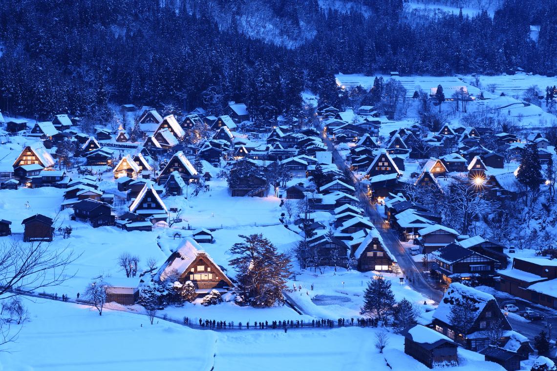 Bốn mùa trong năm ở Shirakawa-go đều đẹp, vì thế bạn không cần lo lắng và cân nhắc thời điểm nào mới thích hợp để đến đây. Nếu mùa xuân Shirakawa-go ngập tràn trong muôn nghìn loài hoa khoe sắc giữa tiết trời ấm áp, thì mùa thu lại tô điểm bằng bức tranh nên thơ của sắc lá vàng, đỏ chuyển màu lung linh. Trong khi đó, mùa hè khiến bạn trở nên thư thái và an yên trong không gian xanh ngát của cây cỏ, bầu trời xanh trong. Đặc biệt, không gian tuyết trắng bao phủ vào mùa đông đã biến ngôi làng thành chốn thần tiên trong những ánh đèn sáng tỏ ẩn hiện những mái nhà trắng xóa, tinh khôi, hệt như những ngôi làng cổ tích ở châu Âu, đem đến cho bạn hành trình trải nghiệm ấn tượng. Tại Shirakawa-go, bạn có thể tìm đến các đài quan sát nếu muốn ngắm nhìn toàn cảnh ngôi làng. Cảm giác đứng từ trên cao phóng tầm mắt bao quát những mái nhà hình tam giác nổi lên giữa những ruộng lúa xanh vào mùa hè hoặc chìm đắm trong những mảng tuyết dày bao phủ ngỡ như bạn lạc vào xứ sở cổ tích của những nàng công chúa kiều diễm, hoàng tử anh tuấn.