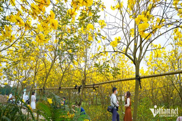Điều đặc biệt, phong linh ở đây được trồng đan xen cây cao, cây thấp, tạo ra nhiều tầng hoa nối tiếp nhau, vàng rực từ gốc tới ngọn. Du khách tới đây như được hòa vào không gian vàng mộng mơ