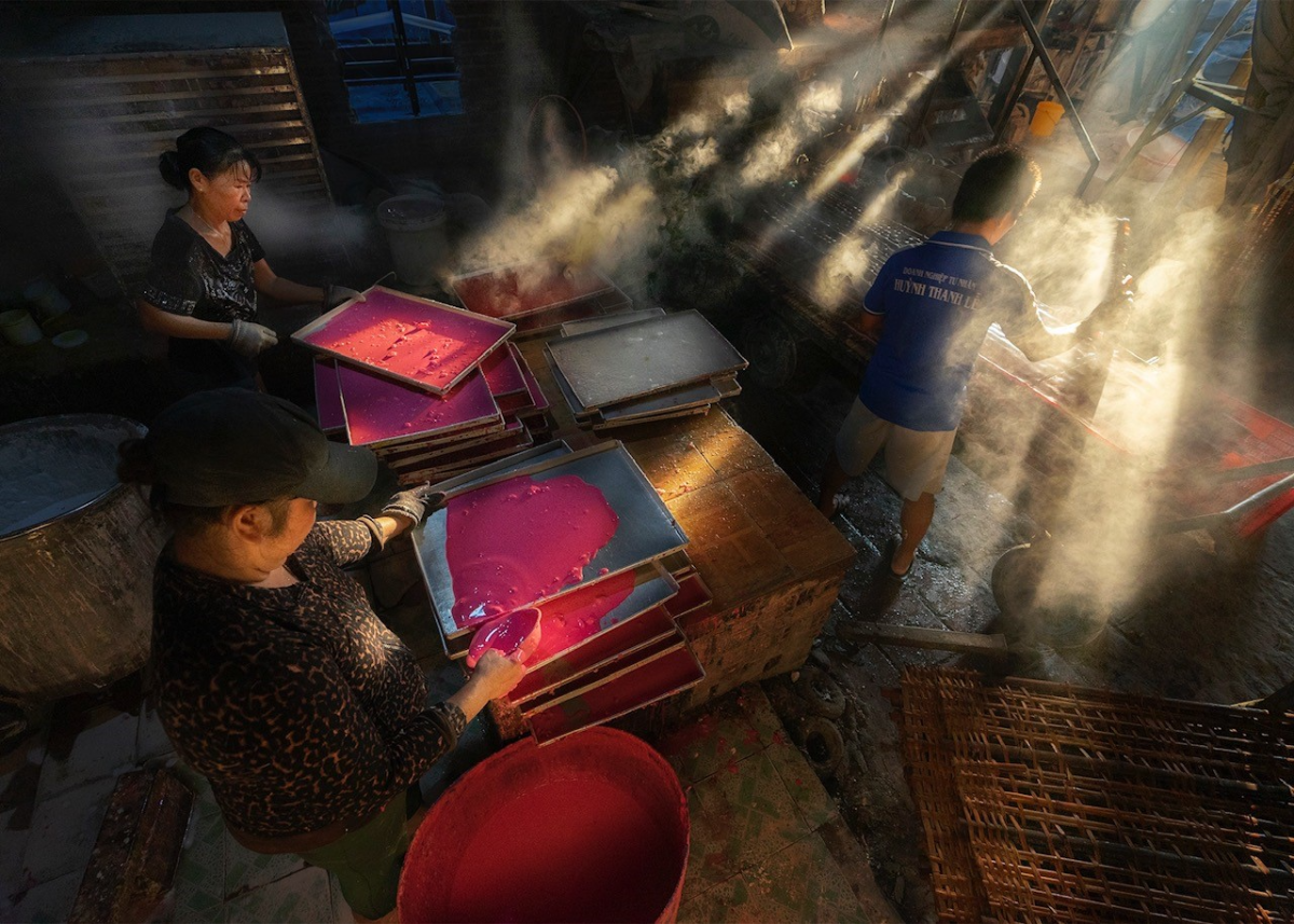 Bức ảnh thuộc bộ ảnh “Bột khoai, đặc sản ẩm thực truyền thống của Tây Ninh” của nhiếp ảnh trẻ Huỳnh Thanh Liêm (32 tuổi) thực hiện tại ba hộ gia đình ở xã Long Thành Nam, thị xã Hòa Thành. Những máy hấp cho ra những mẻ bột khoai bốc khói. Bánh đặt trên giàn tre và được người thợ đội mũ bảo hộ đặt giàn tre trên đầu đem phơi.