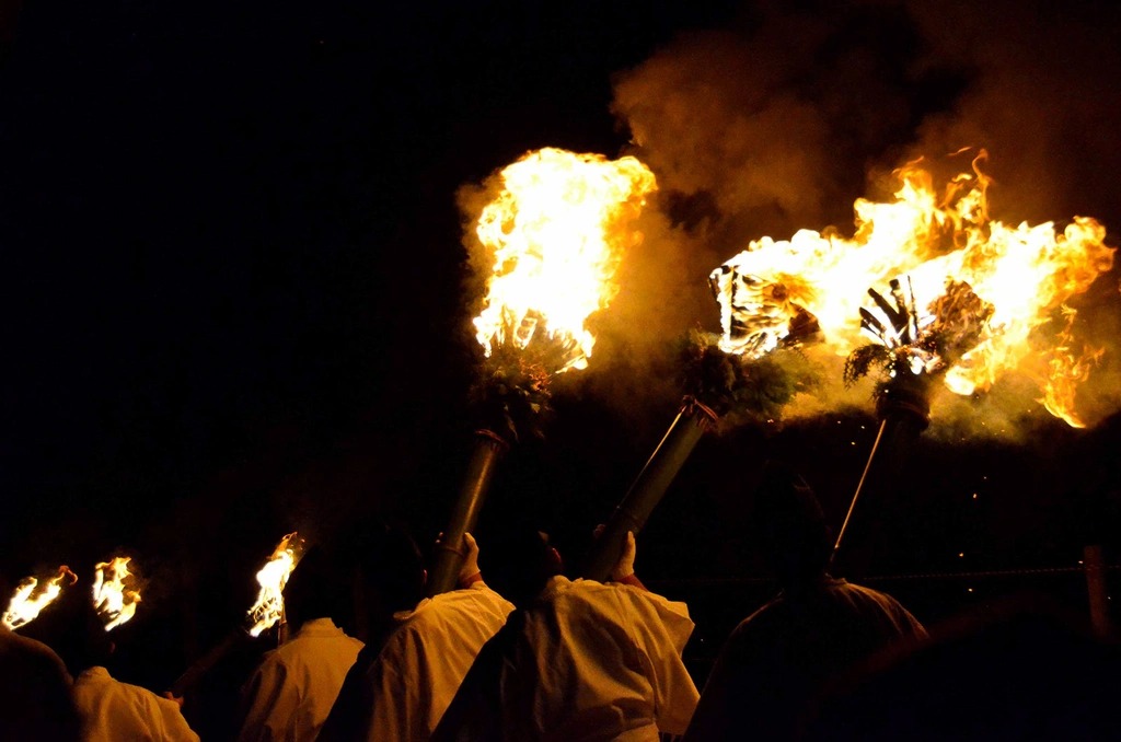Vào khoảng 5h30, đoàn rước đến chân đồi và đốt lên một đống lửa lớn. Ảnh: fun-japan.jp.