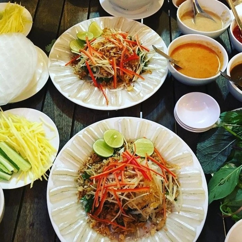 Trong đó, gỏi cá Phan Thiết với ngọt bùi của cá, vị cay nồng của rau tươi, béo của bánh tráng mè quyện cùng nước chấm đặc trưng, tạo nên món ăn đậm vị biển chinh phục nhiều thực khách.