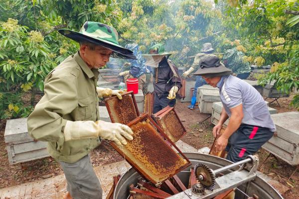 Thành quả của buổi quay mậtNhư lịch hẹn trước, chúng tôi ghé thăm điểm chăn ong của anh Nguyễn Văn Hà. 500 thùng ong của anh từ Đắk Lắk ra Lục Ngạn đã được gần 10 ngày xếp ngay ngắn, gọn gàng xung quanh những gốc vải. Năm nay, thời tiết thuận lợi, ít mưa nhiều nắng, hoa vải nhiều mật, trung bình cứ 3 - 4 ngày, ong cho lấy mật 1 lần. Đến nay, anh đã thu 2 mẻ mật, chuẩn bị thu mẻ thứ 3. Với gần 500 thùng ong, mỗi lần quay mật, anh thu khoảng 2 tấn mật. Khác với mật keo, mật cao su,anh phải bán cho các công ty với giá từ 15 - 17 nghìn đồng/kg, toàn bộ số mật vải của anh thu được tại Lục Ngạn được anh bán tại chỗ cho người dân địa phương với giá bán dao động từ 45 nghìn -50 nghìn đồng/kg.