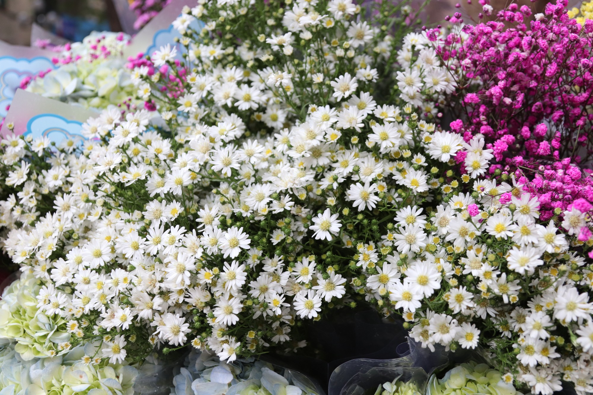 Ảnh: An NhiênMỗi độ thu về, du khách thường bắt gặp cúc họa mi trên những gánh hàng rong len lỏi khắp phố. Khi hòa với những sắc hoa khác nhau, loài hoa này không hề bị lấn át mà nổi bật hơn nhờ vẻ tinh khôi vốn có.