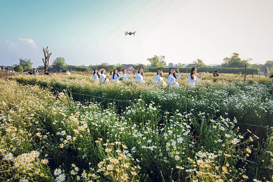 Hằng năm cứ khoảng cuối thu đầu đông, những cánh đồng, vườn cúc họa mi chật cứng du khách - Ảnh: Ngân AnĐể chiêm ngưỡng những cánh đồng hoa rộng lớn với bạt ngàn cúc họa mi du khách có thể đến bãi đá sông Hồng nằm ở cuối ngõ 264 Âu Cơ, thảo nguyên hoa Long Biên, làng hoa Tây Tựu, …
