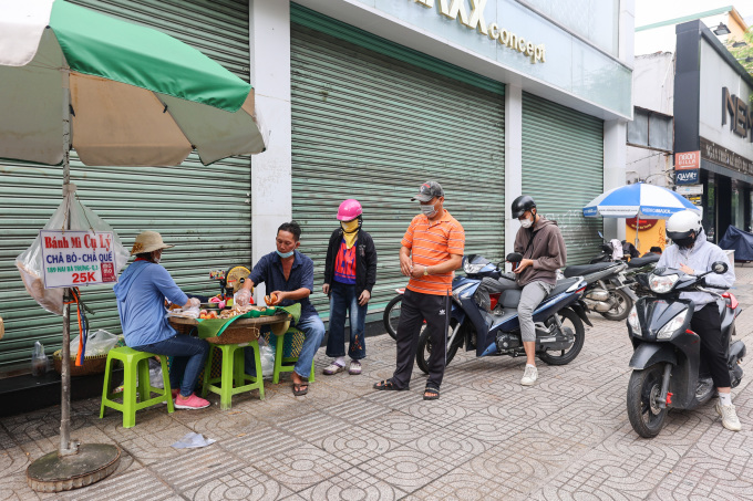 Tuỳ theo số lượng đồ ăn kèm mà khách yêu cầu, một ổ bánh mì có giá 25 - 30.000 đồng. Ảnh: Quỳnh Trần Anh Thiện bán cả tuần, nghỉ ngày chủ nhật và đến khoảng 9h30 là hết hàng. Mỗi ngày mẹt của anh bán khoảng 450 ổ bánh, với 40 kg giò chả, mỗi ổ có giá từ 25 đến 30.000 đồng. Mẹt bánh mì nằm gần các điểm du lịch như nhà thờ Đức Bà, đường sách Nguyễn Văn Bình, Bưu điện thành phố, hồ Con Rùa... Khách có thể mua mang đi, nếu thích có thể ngồi ngay vỉa hè. Gần quán cũng có các tiệm cà phê lớn hay hàng nước.