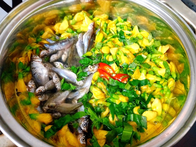 Cứ đến khoảng tháng 9 Âm lịch, cá linh bắt đầu vào mùa sinh sản. Cá chỉ nhỏ bằng khoảng một ngón tay út, có hương thơm đặc biệt, xương mềm tan hòa lẫn vị béo, bùi. Cùng thời điểm này, bông điên điển trổ bông vàng rực. Vì vậy, sẽ thiếu sót nếu về miền Tây mùa nước nổi mà không thưởng thức món cá linh non nấu lẩu cùng bông điên điển.