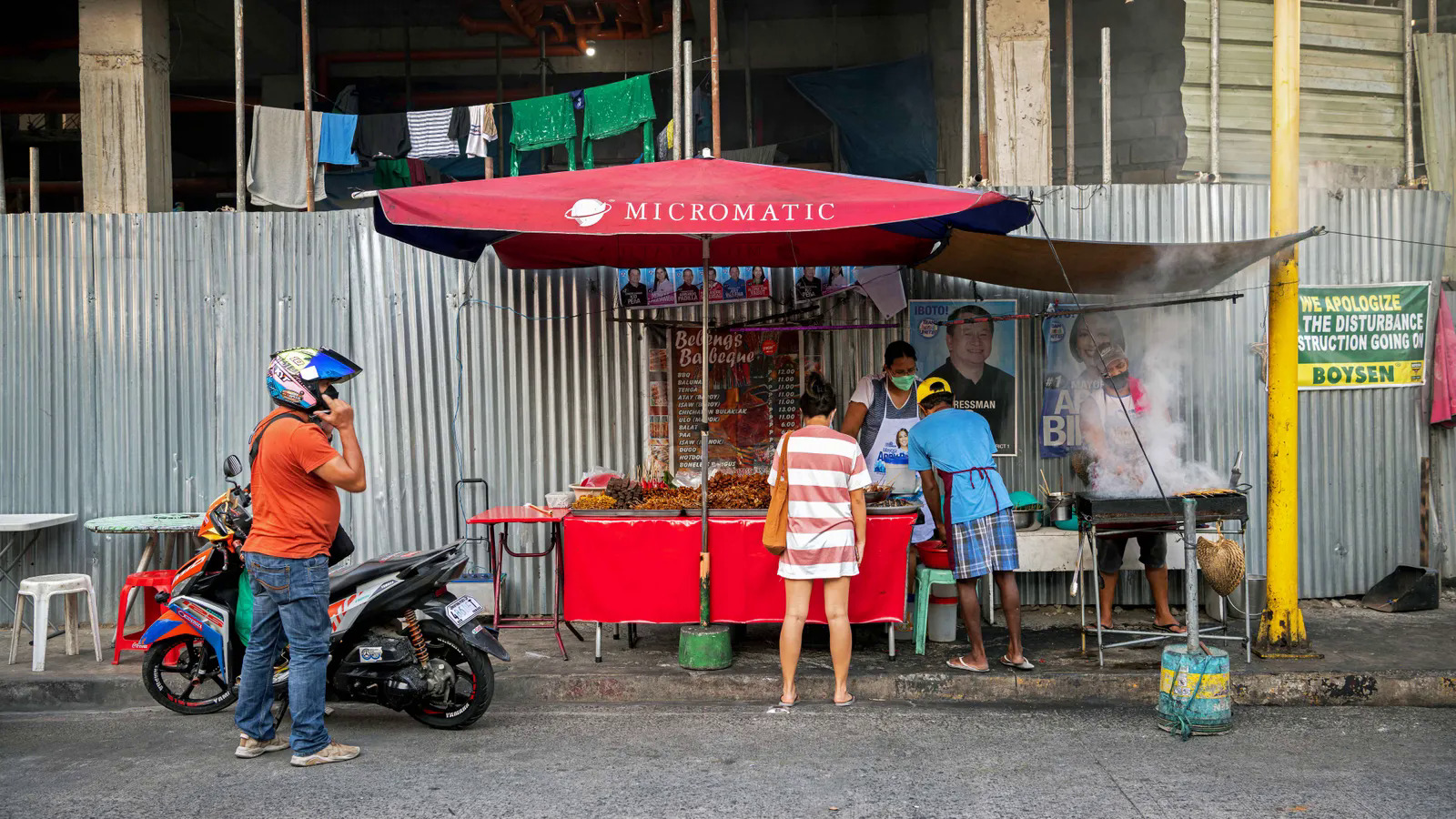Chiều muộn ở vùng thủ đô Manila (Metro Manila), bên rìa khu thương mại Makati và Pasay, xe cộ tấp nập. Hương thơm ngọt ngào, sực nức không lẫn vào đâu được của thịt nướng trên bếp than từ các quán bên lề đường lan tỏa trong không khí.