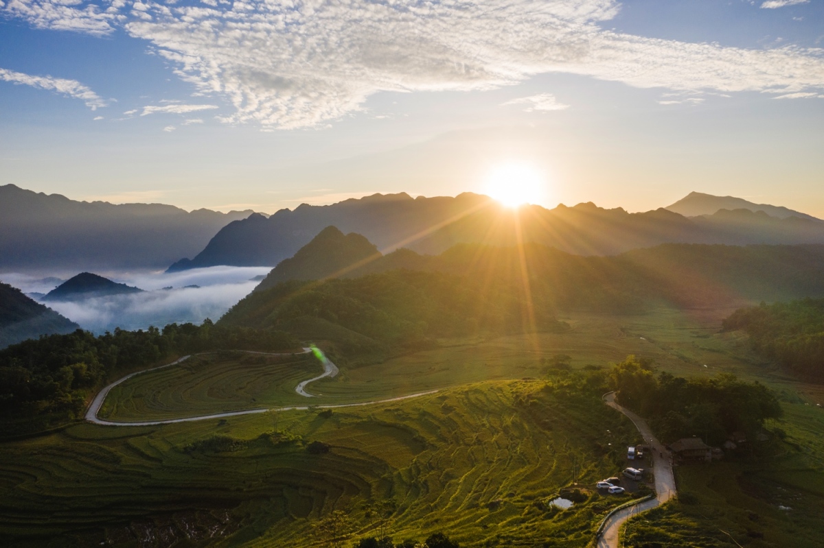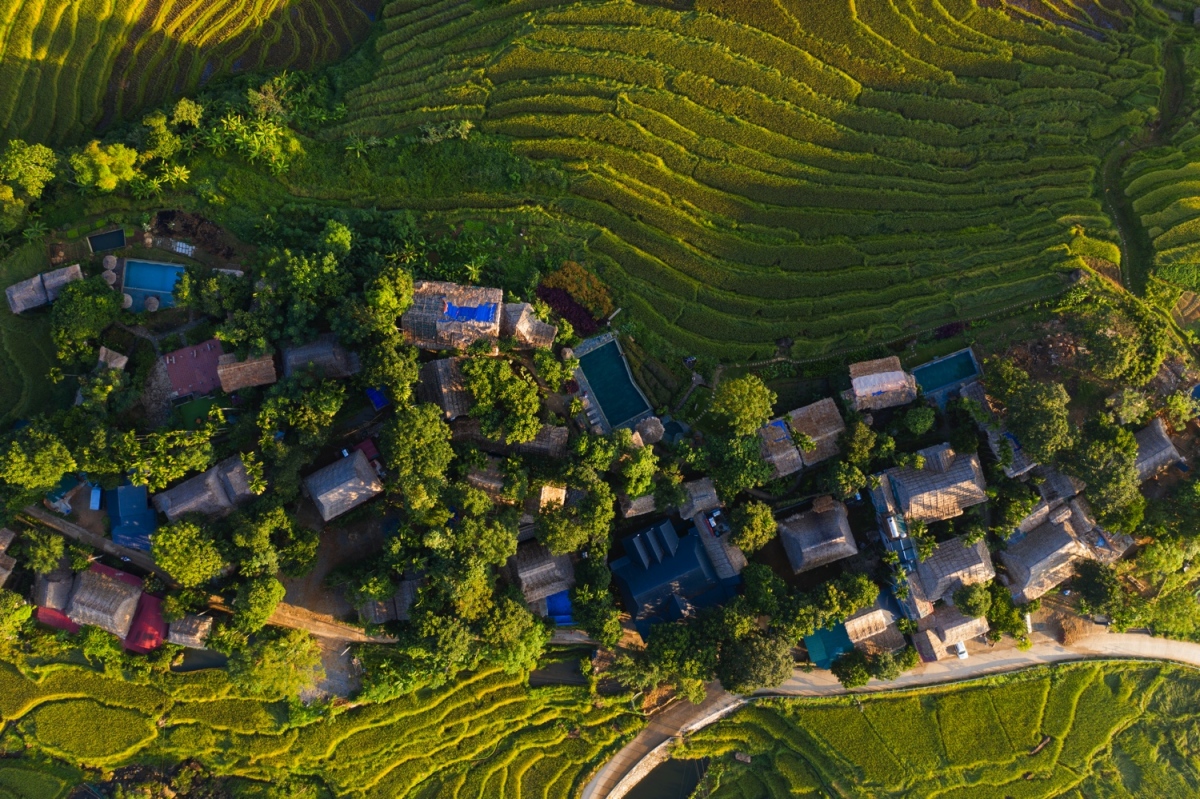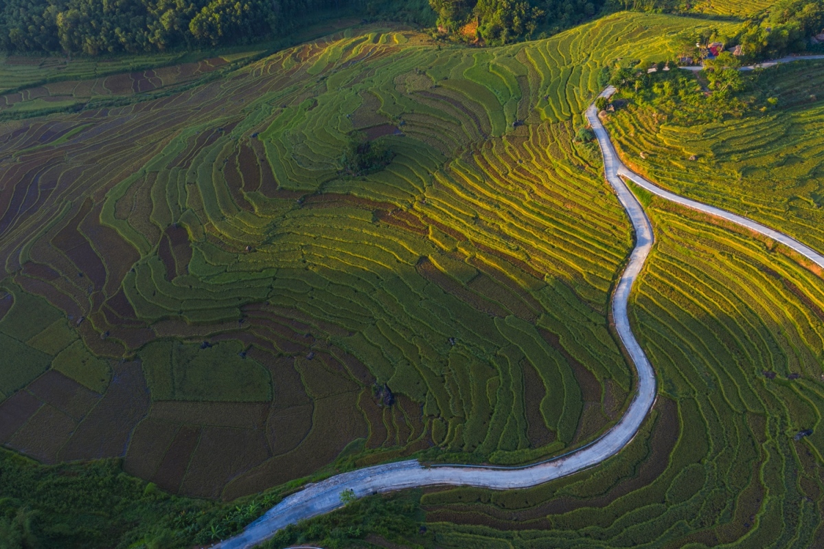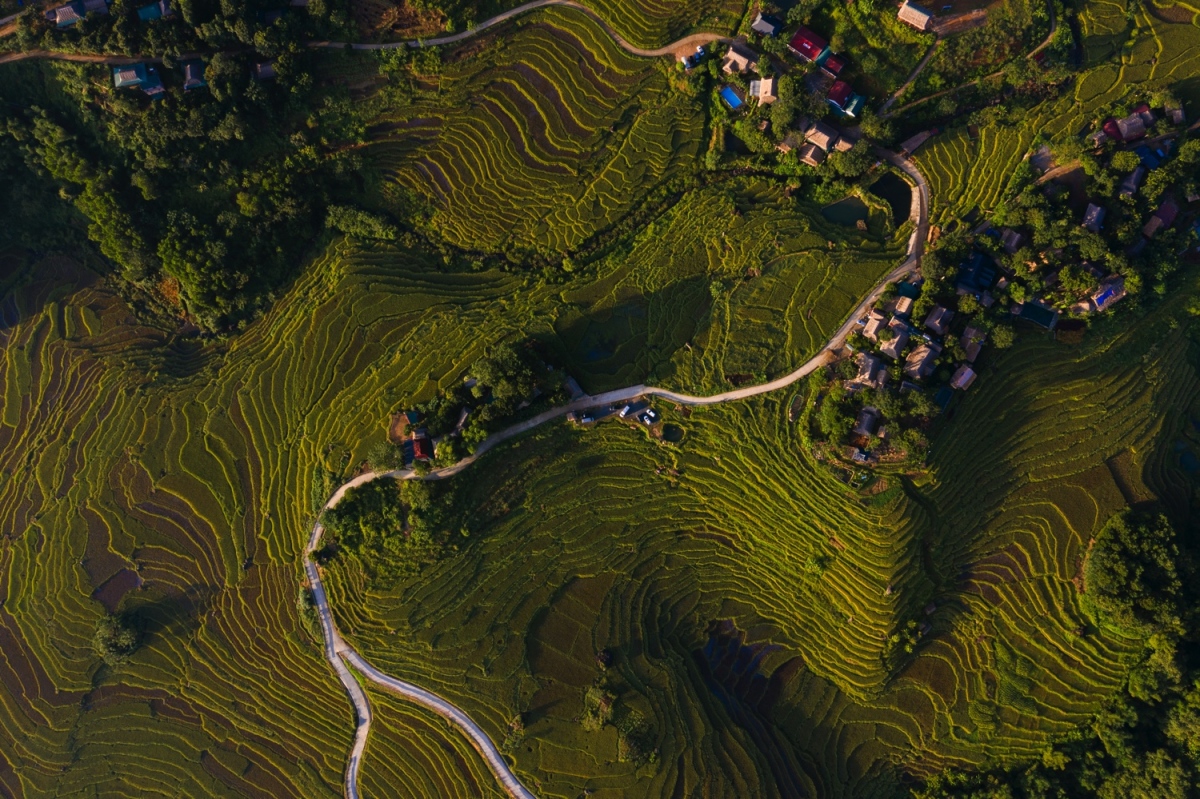 Pù Luông nhìn từ trên cao, các bản làng nằm giữa những ngọn đồi với con đường đi xuyên qua các thửa ruộng, nơi du khách có thể chụp những bức ảnh đẹp về ruộng bậc thang.