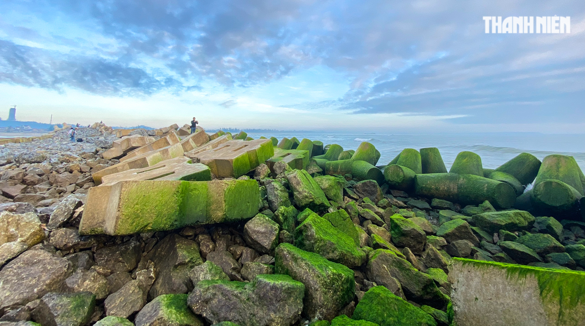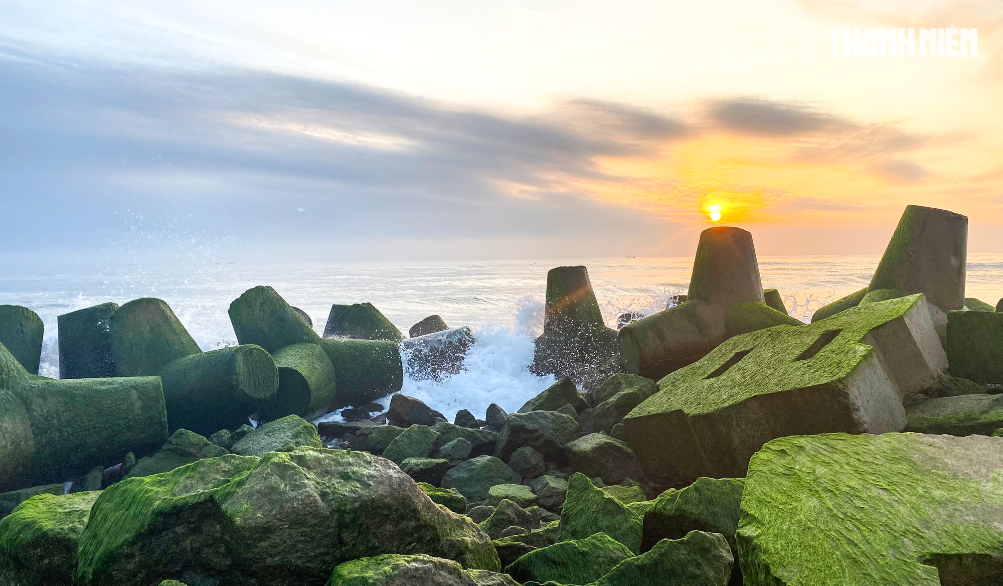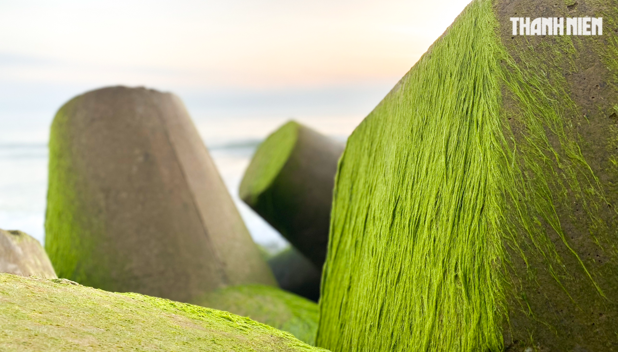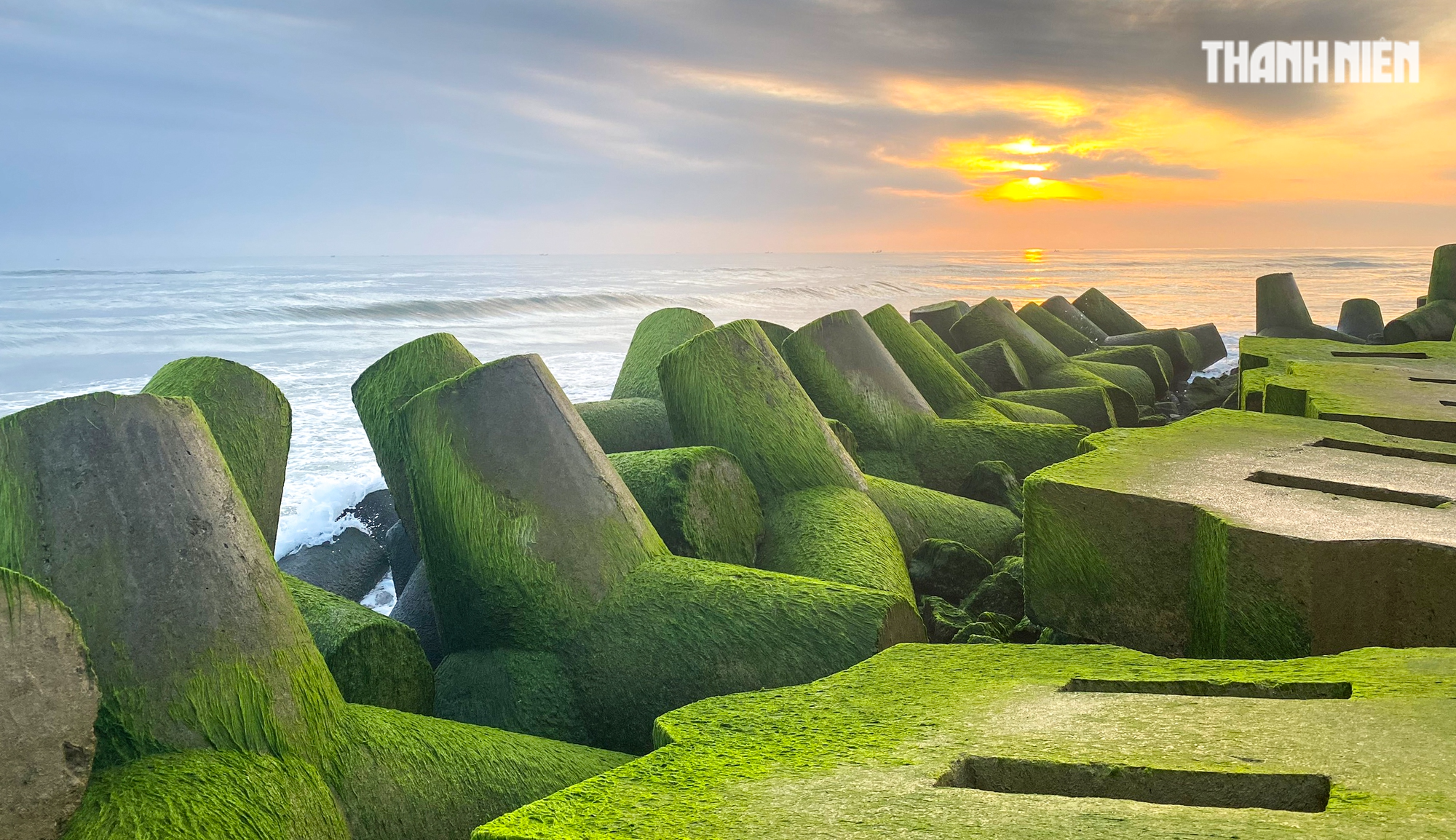 Theo ghi nhận của PV Thanh Niên, sáng 10.2, tại bờ kè chống sạt lở bờ bắc Cửa Đại (thuộc thôn Khê Tân, xã Tịnh Khê, TP.Quảng Ngãi, Quảng Ngãi), rêu xanh mọc bám vào các ụ bê tông dài hàng trăm mét, thu hút nhiều người đến chụp ảnh, săn ảnh đẹp.