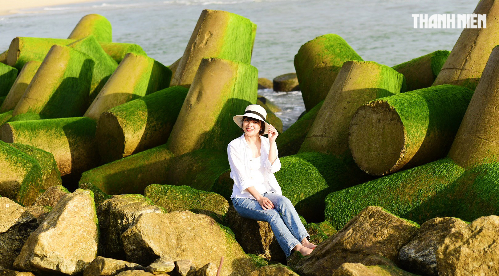 "Rêu xanh ở đây, mọc bám vào các cục bê tông nhìn rất đẹp nên gia đình tôi tranh thủ xuống sớm để đón bình minh và chụp một bộ ảnh để làm kỷ niệm", chị Hiền nói