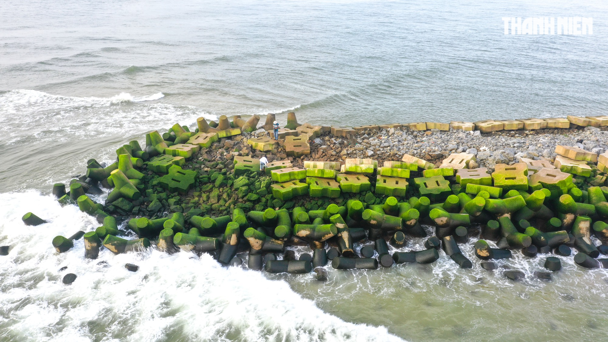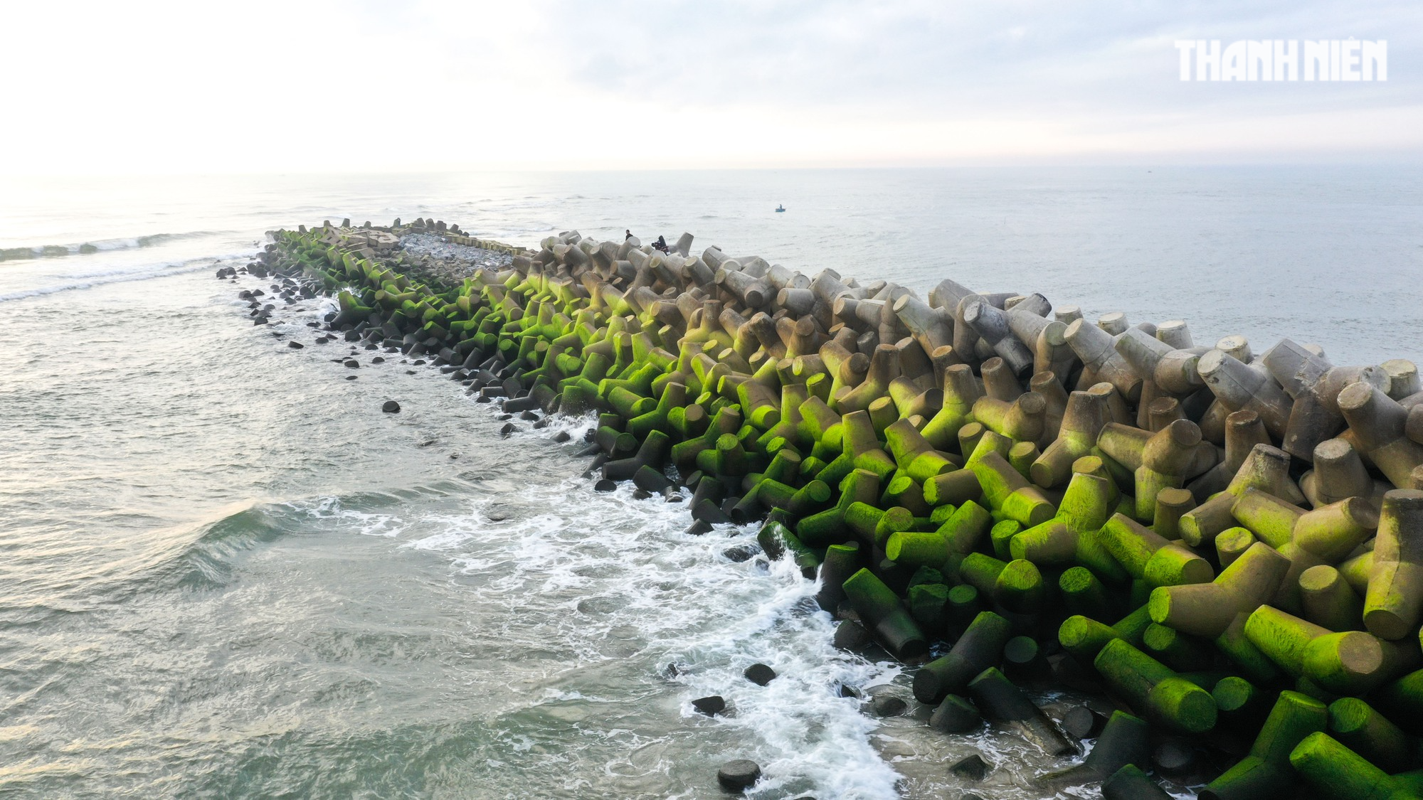 Đê giảm sóng, chắn cát dài khoảng 270m ở bờ bắc Cửa Đại trở nên đẹp hơn với lớp rêu xanh