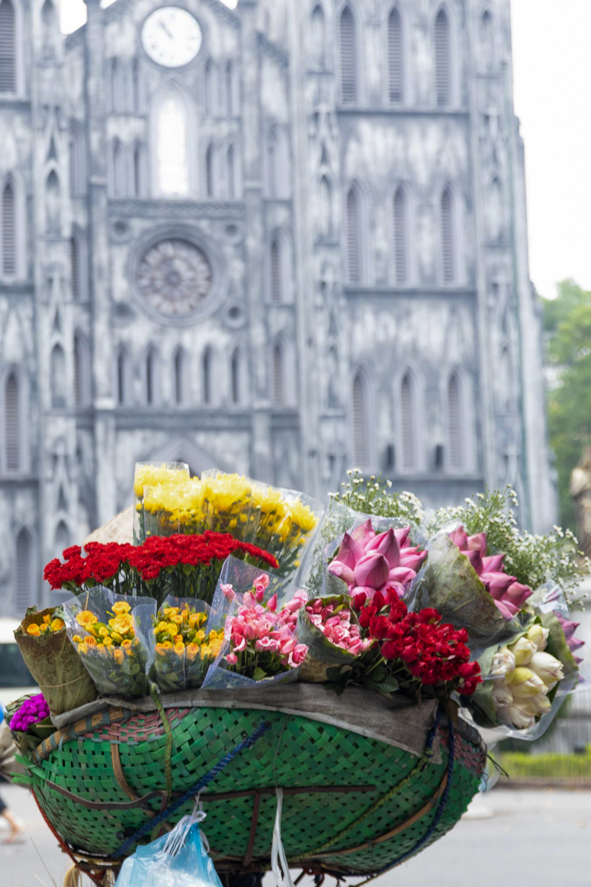Bức ảnh này được chụp trước nhà thờ lớn. Đến thủ đô dịp này, du khách sẽ bắt gặp nhiều gánh hàng rong bán hoa dọc các con phố. Ngoài các loài hoa thông dụng như hồng, vào tháng 9 du khách sẽ thấy cúc được bày bán nhiều hơn.