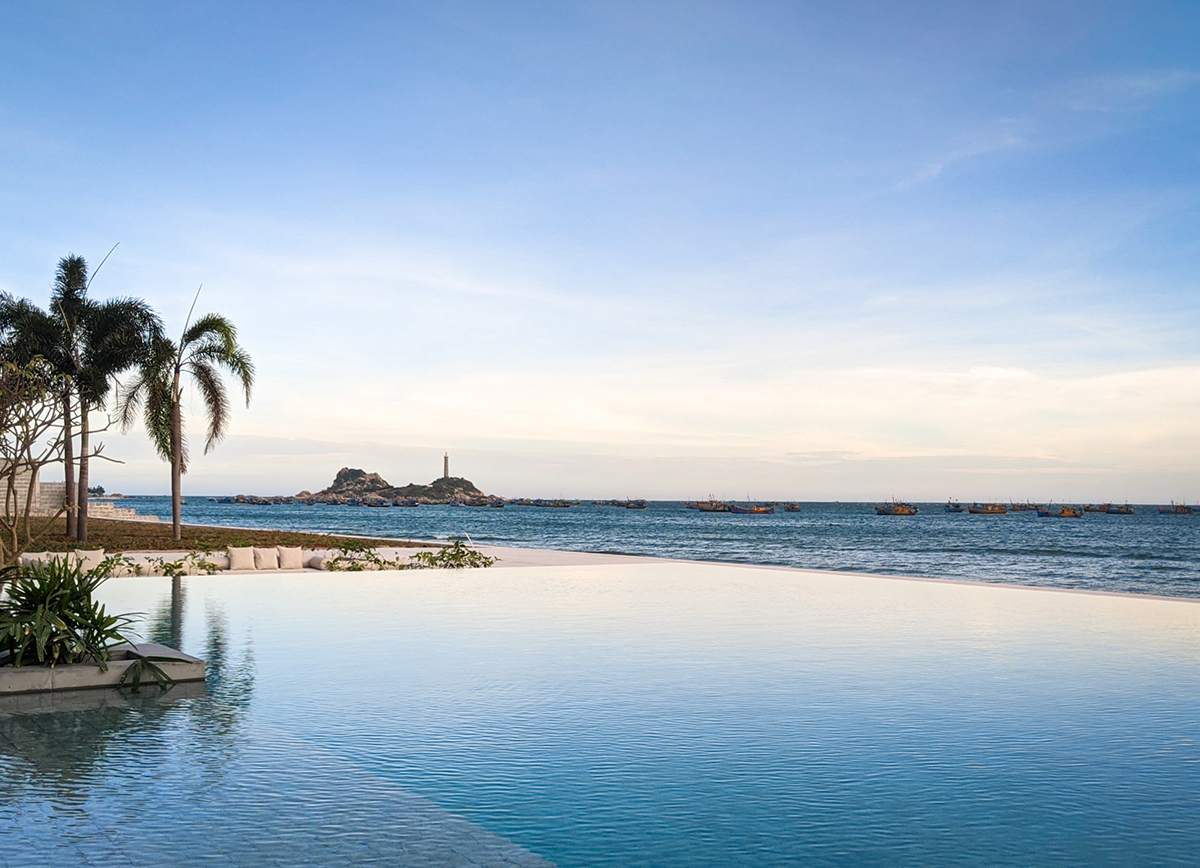 Từ khu nghỉ dưỡng, có thể nhìn ra được mũi hải đăng Kê Gà ở phía đông, còn phía tây là những cồn cát trải dài. Bể bơi vô cực nằm ngay sát biển, là vị trí phù hợp với những hoạt động thư giãn như yoga, thiền định. Đặc biệt, từ đây có thể dễ dàng ngắm bình minh và hoạt động của ngư dân, cảm nhận không khí của một vùng biển yên bình. Ảnh: Khu nghỉ dưỡng