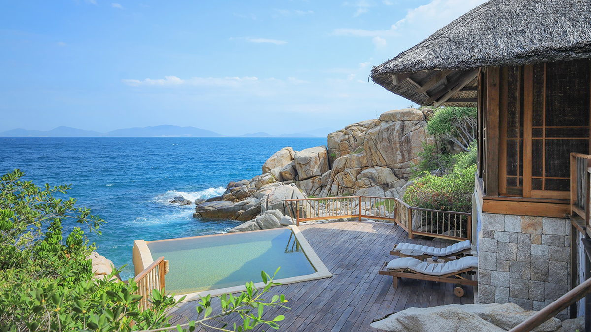 Tại đây bạn có nhiều không gian ngắm cảnh, thiền định và thư giãn. Amanoi cũng gợi ý du khách nên ở đây khoảng 3 đêm để cảm nhận rõ nhất sự bình yên và làm mới lại tâm hồn. Các phòng có hiên tắm nắng, nhìn ra biển hoặc núi. Biệt thự rộng nhất có 5 phòng ngủ và hồ bơi vô cực lớn. Một đêm nghỉ tại đây có giá từ 25 triệu đồng. Ảnh: Khu nghỉ dưỡng