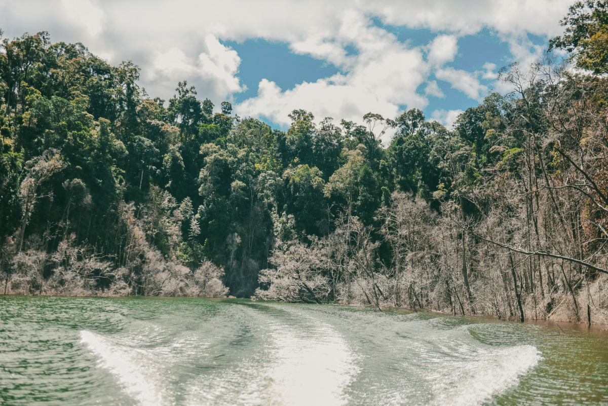 Quá trình tích nước nhiều năm trong lòng hồ của công trình thủy điện vô tình đã khiến cho hàng trăm cây thông xung quanh hai bờ sông bị ngập nước, không còn khả năng phát triển và ngả sang màu trắng ngà. Dọc hai bên đường xuôi theo lòng hồ là thông trắng xen kẽ thông xanh phía sau.