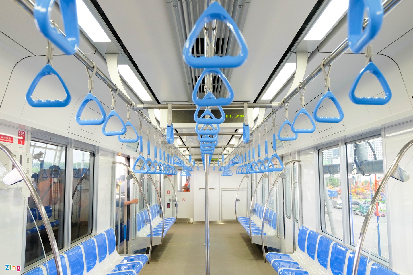 Bước vào khoang tàu, khách tham quan được trải nghiệm những khoang ghế ngồi hiện đại với màu xanh, điều hòa mát mẻ. Khoang tàu rộng rãi, dù hành khách đứng kín khoang, người ngồi vẫn cảm thấy thoải mái, không bị ngộp hay chật chội, khó chịu.