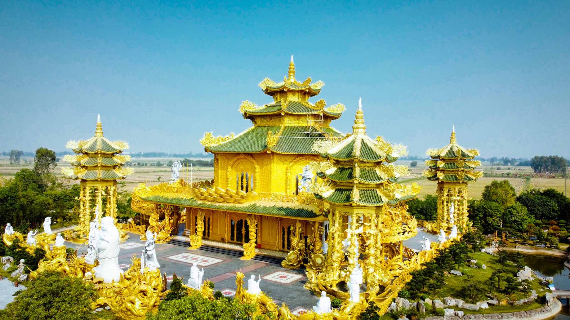 Chùa được lợp ngói men xanh ngọc và sơn phủ vàng tạo thành kiến trúc nổi bật, bao quanh là cánh đồng lúa bát ngát. Ảnh: Vương Lộc