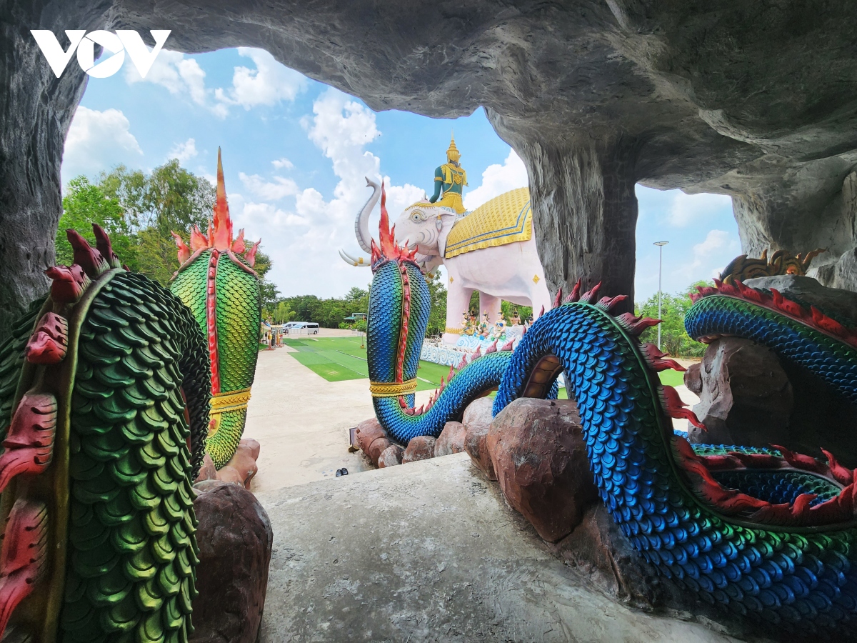 Khi bước vào chùa Wat Dan Phra In, du khách sẽ thấy tượng thần Indra cưỡi voi ba đầu màu hồng cho thấy sự uy nghiêm và linh thiêng của ngôi chùa này.