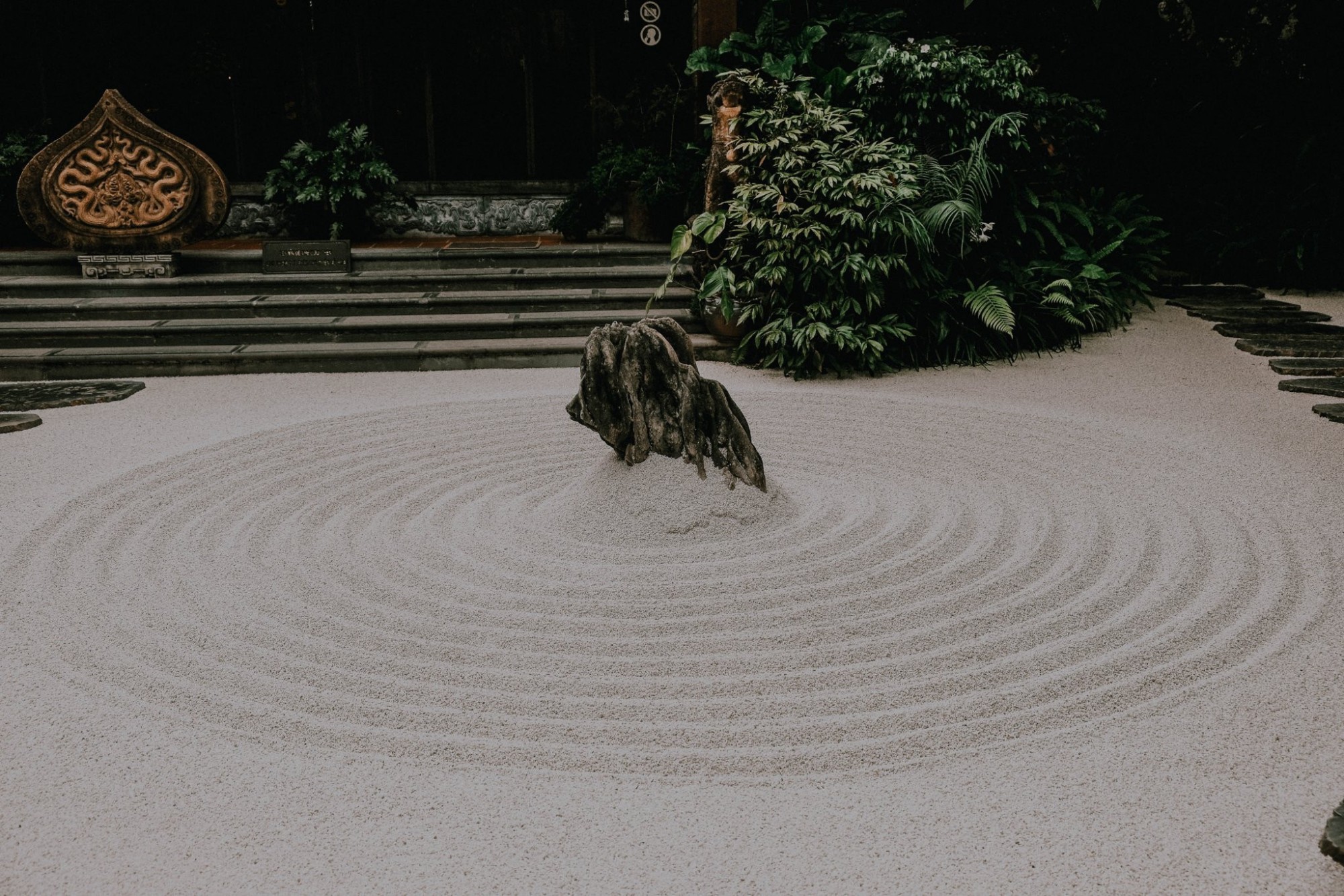 Đường vào chùa được trải đều bằng những viên sỏi trắng thay vì lát gạch đỏ như thông thường. Ngay trước khu Tổ đường, du khách sẽ bắt gặp Khổ Hải, là 12 vòng tròn được vẽ trên nền sỏi tượng trưng cho 12 nhân duyên của con người. Sỏi trắng mang ý nghĩa của sự thiền định nên được sử dụng rất nhiều trong chùa.