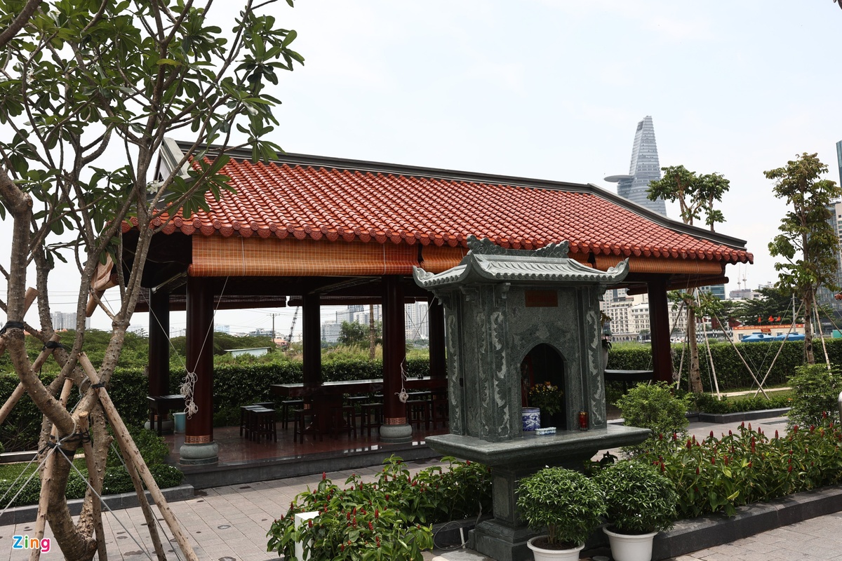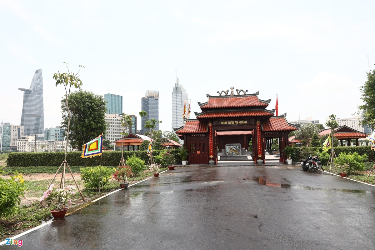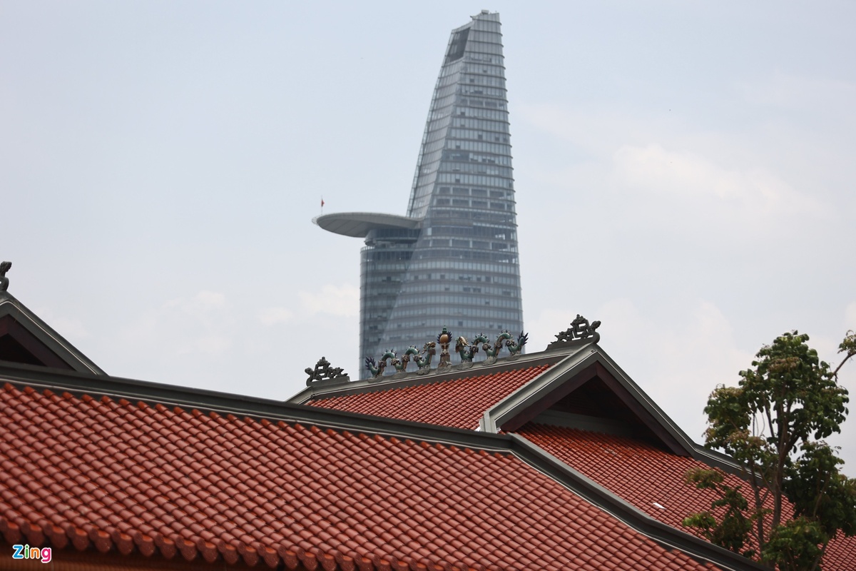 Từ cổng đình được xây dựng theo lối tam quan truyền thống với hai tầng mái, mọi người có thể nhìn thấy các công trình biểu tượng của TP.HCM thấp thoáng đằng sau như tòa nhà Bitexco, công viên Bến Bạch Đằng...