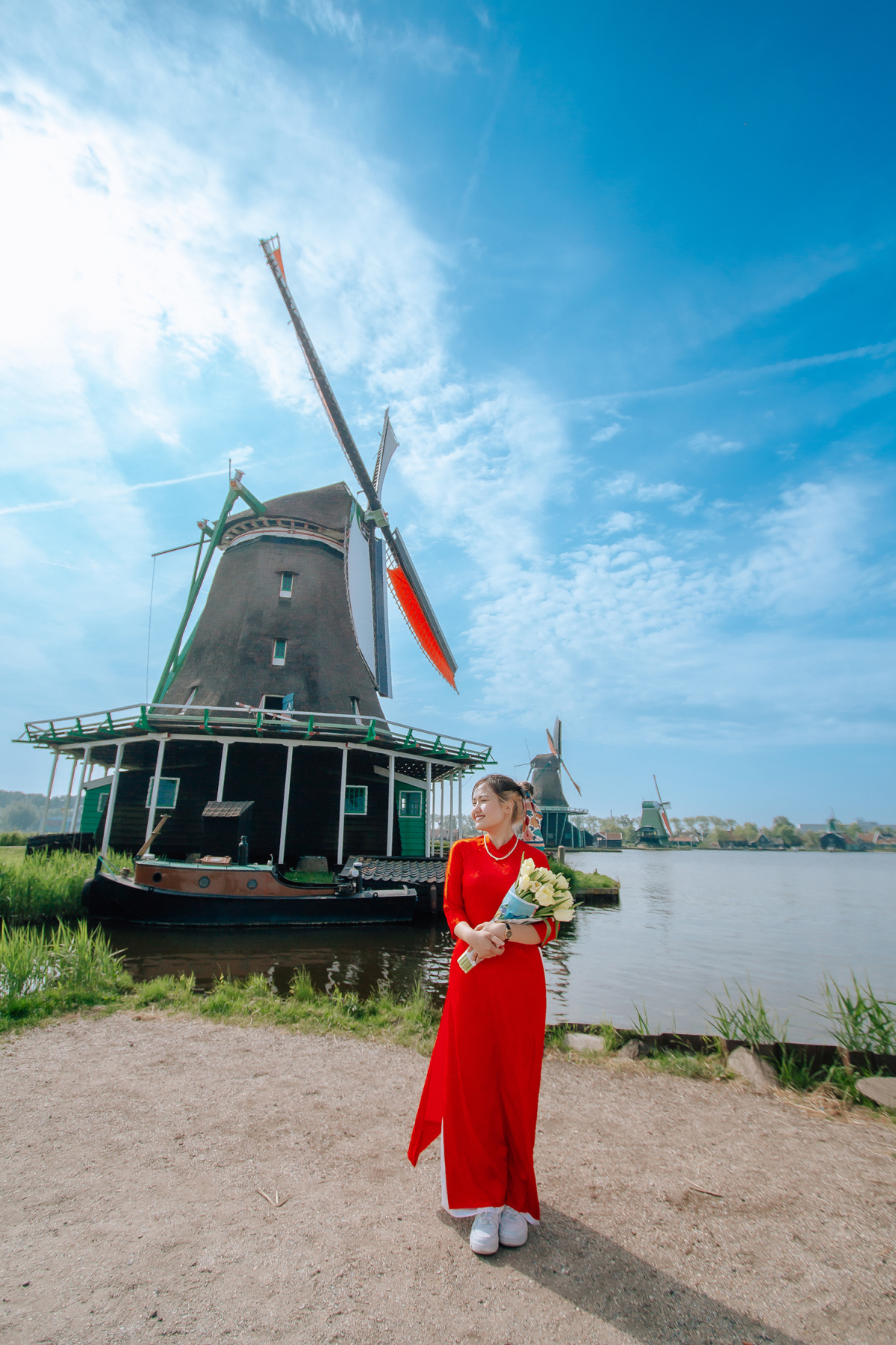 Minh Hiếu mặc áo dài Việt Nam để chụp ảnh kỷ niệm. Ở làng Zaanse Schans, du khách có thể tham quan bên trong De Kat - cối xay sản xuất bột màu duy nhất còn hoạt động kể từ đầu những năm 1900, bản sao của cối xay gió cắt gỗ Het Jonge Schaap xây từ năm 2005 (bản gốc ra đời từ năm 1680 đã bị phá hủy vào năm 1942).