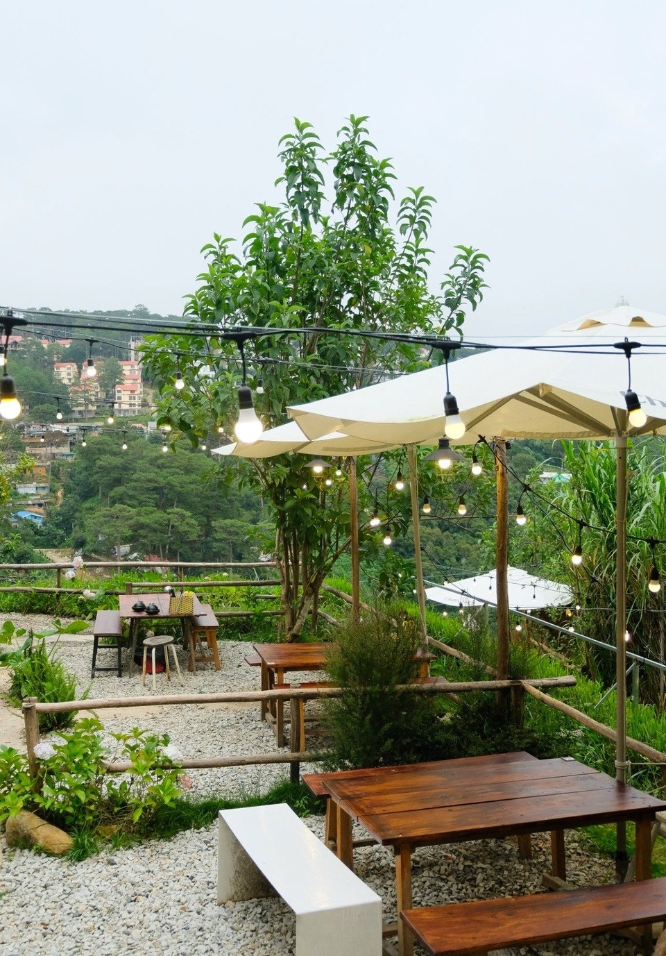 Quán có vị trí đắc địa ở giữa rừng thông. Ảnh: Thông Giông. Quán mang tông màu nâu ấm cúng, có không gian trong nhà rộng rãi với những ô cửa sổ lớn. Phần lớn khách đến đây đều chọn ngồi ngoài ban công để ngắm phố núi từ trên cao. Bạn phải đặt bàn trước qua fanpage của quán.