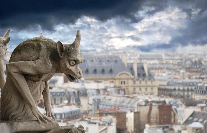 Một trong số 56 bức tượng chimera nằm trên hành lang kết nối 2 tháp chuông. Những bức tượng này là các con vật kỳ quái xuất hiện trong các truyền thuyết phương Tây. Trước đây, chúng là những biểu tượng của tà ác và nguy hiểm, đe dọa những người không tuân theo giáo lý nhà thờ. Ảnh: Pinterest.
