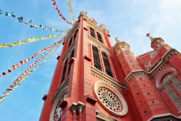 Là một trong những nhà thờ xưa nhất ở TP HCM, được xây dựng từ năm 1870, dưới sự giám sát của Cha Donatien Éveillard. Công trình thiết kế theo phong cách La Mã, với kiến trúc Gothic, Phục Hưng cùng màu hồng đặc trưng, từ những tòa tháp, cột và ô cửa sổ. Bên trong, nhà thờ sơn màu hồng dâu và kem. Ảnh: Nitsawan Katerattanakul/Shutterstock.