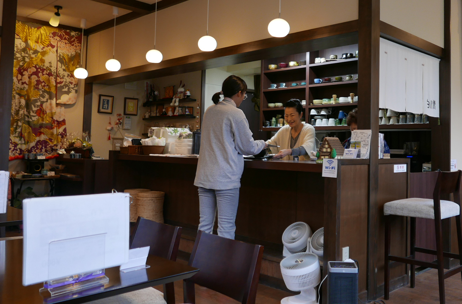 Cả ngôi làng lớn vậy nhưng chúng tôi chỉ tìm thấy một quán ăn bé, bề ngoài cũng như mọi ngôi nhà cổ khác, không có biển hiệu mà chỉ có biểu tượng nhà hàng khiêm tốn treo trên cửa. Menu của quán có nhiều loại mì với giá hợp lý, có cả mì udon cà ri. Chúng tôi chọn hai loại mỳ udon truyền thống, 1.000 yên/bát (180.000 đồng) được trình bày bắt mắt, thanh lịch và hài hòa cả về màu sắc và hương vị. Ngồi ngắm ngôi làng cổ độc đáo của đất nước này, hít thở không khí núi rừng phương Bắc và thưởng thức mì udon nóng hổi là một trải nghiệm đáng giá với chúng tôi.