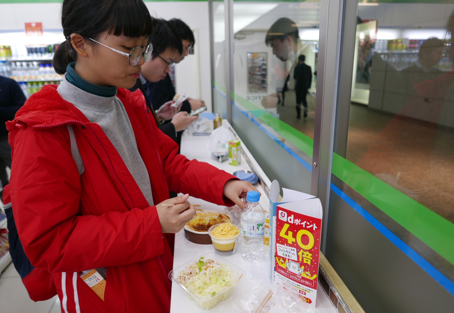 Nhưng không phải ở đâu cũng có chợ để lê la cơm bình dân. Có những bữa chúng tôi ăn cơm tại các ga tàu điện ngầm, thực chất là những khu tổ hợp mua sắm dưới lòng đất. Đây là nơi nhiều dân văn phòng ghé qua, bày bán món ăn chế biến sẵn, có lò vi sóng, lò nướng để làm nóng thức ăn cho khách. Cũng giống như ở Hàn Quốc, cửa hàng tiện lợi thường không có ghế, chỉ có các kệ dài gắn cố định vào tường, khách bày đồ lên kệ và đứng ăn. Người Việt Nam chưa quen với kiểu ăn đứng thế này, nhưng ở những nước phát triển tôi từng đi qua thì cách phục vụ như thế khá phổ biến. Bữa ăn của chúng tôi trong cửa hàng tiện lợi cũng khá rẻ, khoảng hơn 100.000 đồng một người bao gồm cơm thịt bò phomai, salad cá ngừ, tráng miệng với kem và bánh cá.