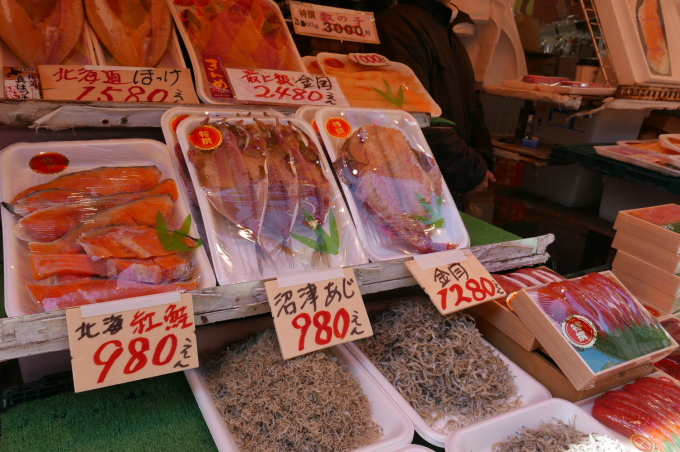 Đồ ăn được bày bán nhiều trong các khu chợ Nhật. Cá hồi, cá ngừ tươi, trứng cá, thịt bò, lươn Nhật... được bán trên phố chỉ với 400-500 yên một khay (72.000-90.000 đồng). Chúng tôi mang về hostel nấu khoảng 15 phút là có bữa ăn ngon, nhiều món còn ăn sống được mà không cần chế biến. Bạn bè nghe tôi kể sang Nhật toàn tự nấu ăn, lấy làm thương, "sao đi du lịch khổ thế". Thực ra đối với những người thích du lịch tự túc thì nấu nướng vừa là một thú vui lớn, vừa là cách tốt nhất để tiết kiệm chi phí.