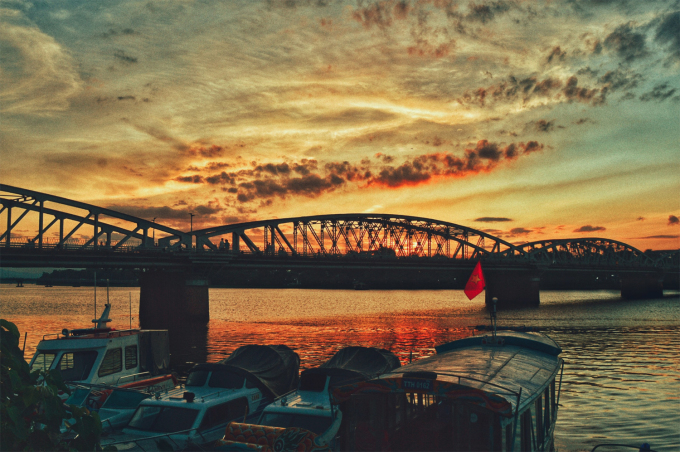 Chân cầu Trường Tiền. Đây là ba địa điểm cùng nằm chung ở khu vực dưới chân cầu Trường Tiền. Tản bộ từ phía dưới chân cầu có thể ngắm hoàng hôn chiều tà xuyên qua cầu. Vốn là photographer, Trân Ơi cho biết vào những ngày trời nắng gắt, các tín đồ đam mê chụp ảnh có thể ghi lại khung cảnh áng mây hoàng hôn in bóng thẳng xuống dòng sông Hương rất đặc biệt.