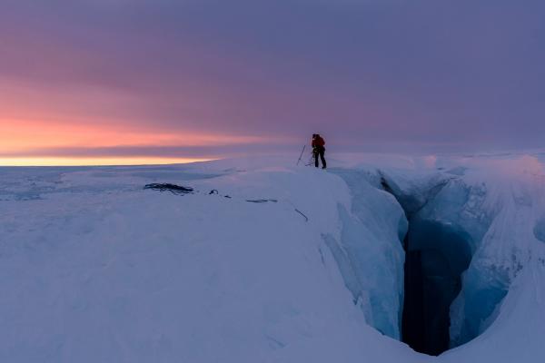 Nhà nghiên cứu Matthew Covington đang tiến xuống một động băng dựng đứng khi David Ochel bên dưới điều chỉnh các thiết bị bảo hộ. Covington là thành viên của nhóm nghiên cứu sông băng tại Greenland.