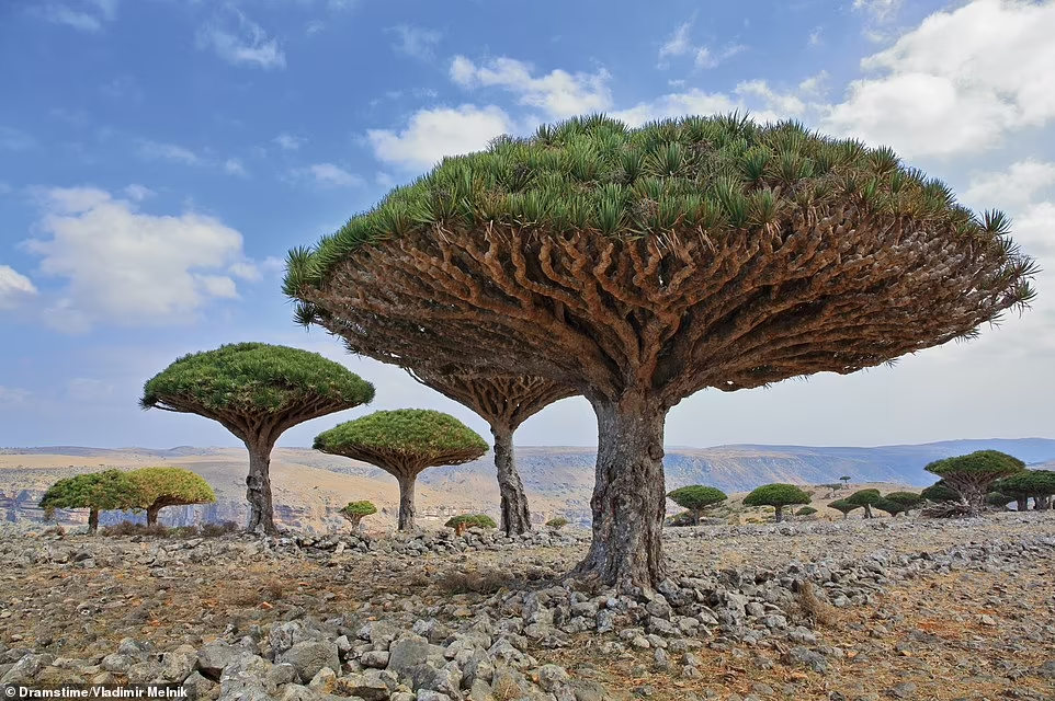 Cây máu rồng mọc ngược là một trong những loài thực vật thú vị nhất trên thế giới. Khu rừng cây máu rồng này nằm ở Yemen. Số lượng loài cây này đang suy giảm đáng kể vì sự phá hoại của những cơn bão. Mặt khác, nó cũng chịu ảnh hưởng từ việc chăn thả dê quá mức. Nhựa màu đỏ của cây lại được sử dụng làm thuốc nhuộm.