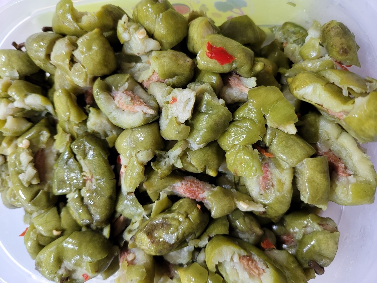 Cà na được chế biến theo nhiều cách như ngâm muối ớt, xóc muối ớt, ngâm đường... Cà na cũng có thể được ăn sống, nhưng phải đập dập sơ qua rồi chấm muối ớt. Vị cà na ăn sống hơi chua chát, hợp với vị mặn của muối và cay của ớt. Ai là người miền Tây hoặc từng sống ở miền Tây, sẽ mang theo vị chua chát cay mặn này mà đi khắp nơi, không thể nào quên (ảnh: VI NGUYỄN).