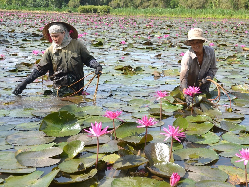 Bông điên điển ngon nhất khi được nấu canh chua (hay lẩu) với cá linh đầu mùa. Hoặc xào với tép đồng, đổ bánh xèo hay chỉ đơn giản là xào với hành tỏi cũng đủ một bữa cơm ngon. Nếu về vùng Châu Đốc, An Giang, nơi lũ đến sớm nhất ở miền Tây, du khách còn được thưởng thức món bún cá lóc rau nhút bông điên điển nổi tiếng (ảnh: HUỆ MẪN).