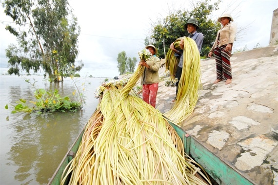 Cọng bông súng dài theo con nước mùa lũ, được nông dân thu hoạch về bán. Mùa này về miền Tây, vào các chợ, du khách sẽ tận mắt chiêm ngưỡng cảnh các cô các chị quấn cọng bông súng từng khoanh tròn như một tác phẩm nghệ thuật (ảnh: TÉP BẠC).