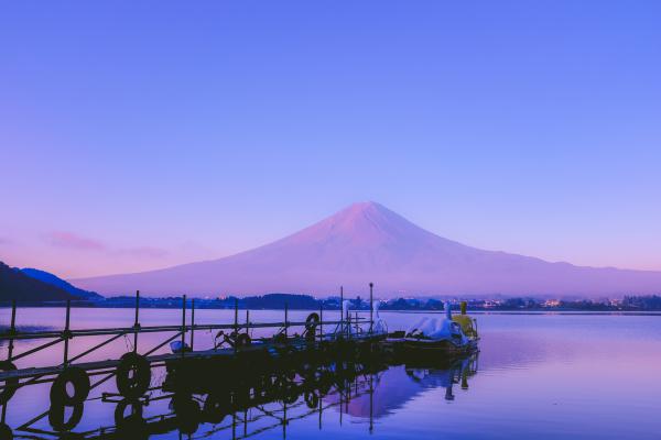 Ngọn núi cao nhất Nhật Bản được bao phủ bởi bầu trời tím hồng của ánh bình minh khi nhìn từ bến tàu du lịch hồ Kawaguchi. Hầu như lúc nào trong ngày hồ Kawaguchi cũng đông khách du lịch ngược xuôi trên những chiếc thuyền đạp vịt. Chỉ có duy nhất sớm tinh mơ chúng ta mới có dịp chứng kiến mặt hồ phẳng lặng như tấm gương khổng lồ thế này.