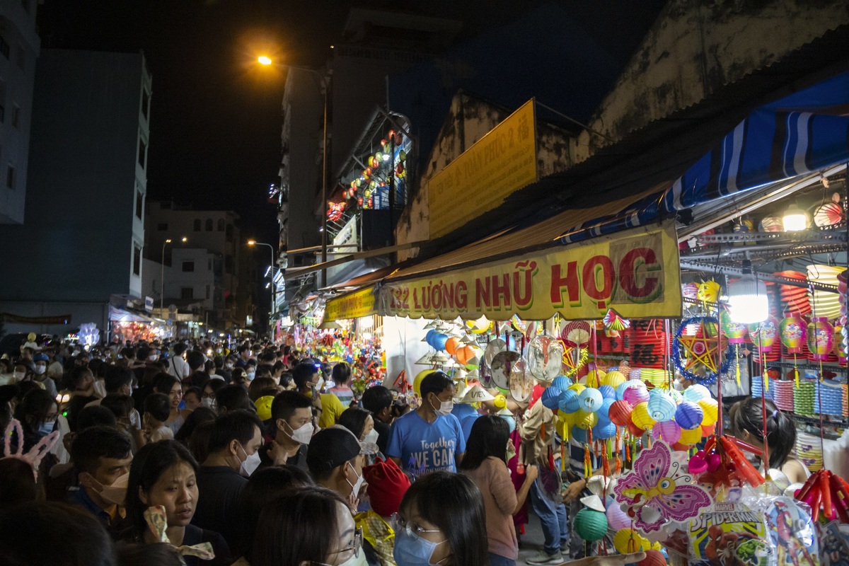 Vốn là điểm đến truyền thống vào dịp Trung thu, lượng người đổ về phố lồng đèn ngày càng đông, trong đó có gia đình anh Vũ Hòa Hiệp, đến từ quận Tân Phú. "Tôi thích chơi ảnh nên hay đến những nơi có sự kiện vui chơi như thế để tác nghiệp, khi chụp tôi xin phép dân, còn họ thì vui và thoải thoải", Trung nói.