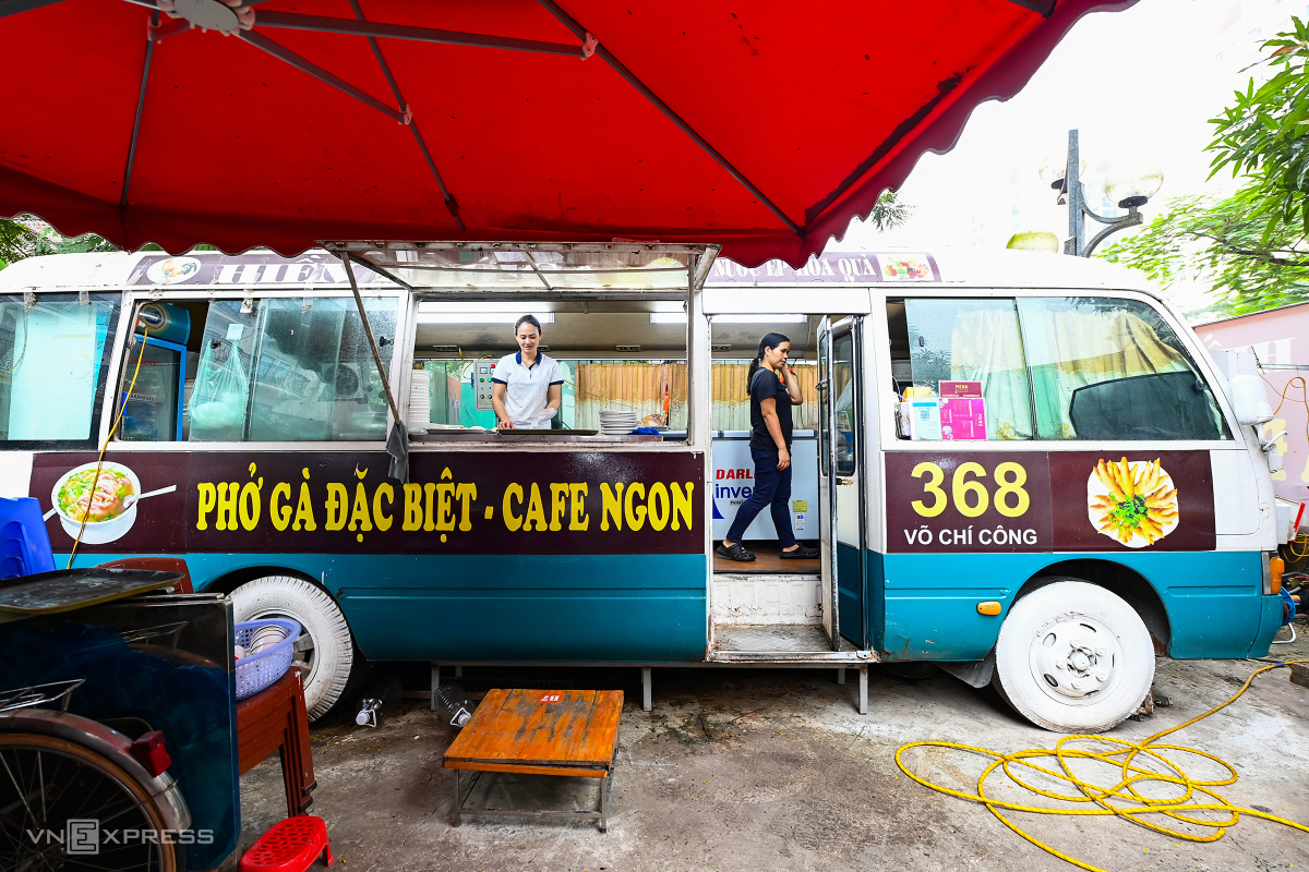 Quán phở gà xe khách nằm trên đường Võ Chí Công (quận Tây Hồ) của chị Tạ Thị Thu Hiền gây chú ý cho nhiều thực khách. Quán được biến tấu từ xe khách 29 chỗ, tháo bỏ toàn bộ động cơ, thiết kế lại để tận dụng làm bếp.